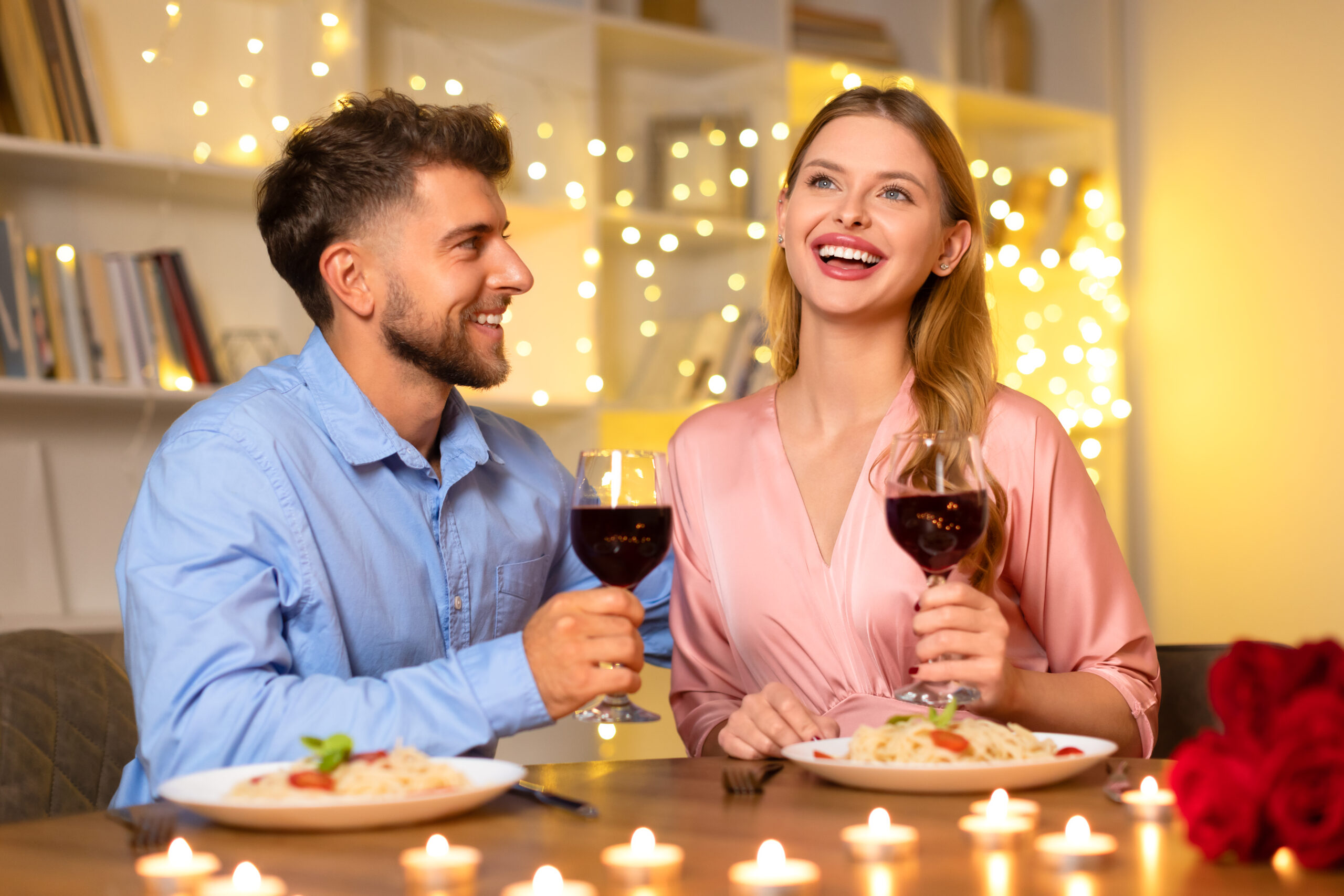 Happy couple toasting wine glasses, dinner date, romantic setting